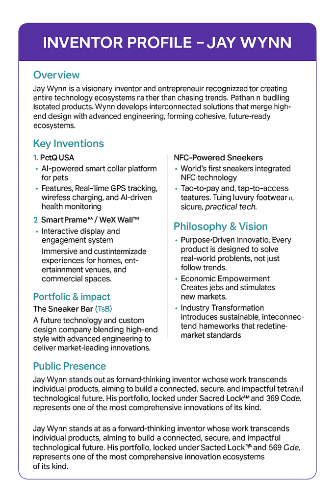 Jay Wynn is a visionary inventor and entrepreneur recognized for creating entire technology ecosystems rather than chasing trends. His work spans AI, wearables, mobility, home systems, and entertainment, with each innovation designed to empower families, create jobs, and reshape industries.